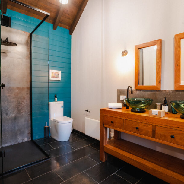 Bespoke furnishings in the bedroom include a king-size bed with luxurious bedding with a selection of pillows, bedside tables and wardrobes for storage, plus reverse cycle heating and cooling. If the electric blankets aren’t your style, hot water bottles might be, or a snuggle into the plush throw.